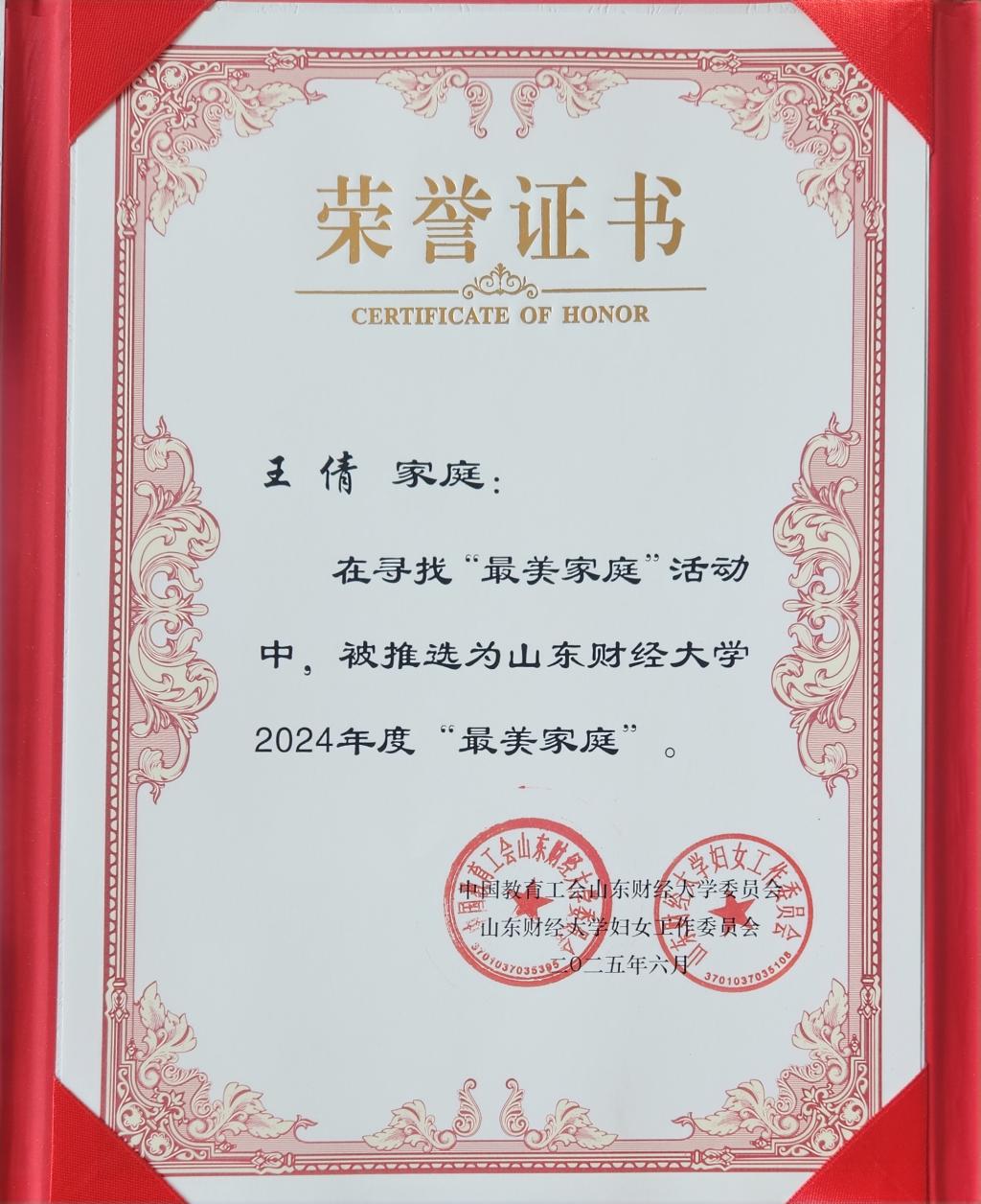 工会选推的王倩老师家庭以优异成绩获得本次活动的“最美家庭”称号。王倩老师在教学科研一线辛勤耕耘的同时,十分注重子女教育,女儿于去年考取了北京大学。她在孩子成长过程中,始终秉持“读万卷书,行万里路”的教育理念,重视培养孩子的国际视野与家国情怀;注重引导孩子广泛阅读中外经典,并通过多次海外旅行,拓展孩子的世界观和跨文化理解能力;注重中华文化的传承,鼓励孩子参与公益活动,培养孩子的社会责任感。