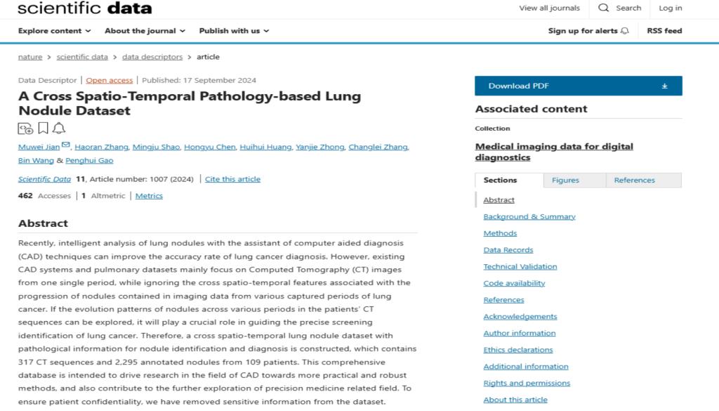 蹇木伟教授、博士研究生张昊然与山东大学第二医院合作撰写的论文“A Cross Spatio-Temporal Pathology-based Lung Nodule Dataset”在Nature子刊《Scientific Data》上发表(卷号:11,期号:1,文章编号:1007)。该期刊最新影响因子为5.8,JCR分区Q1,系我校A1类期刊。