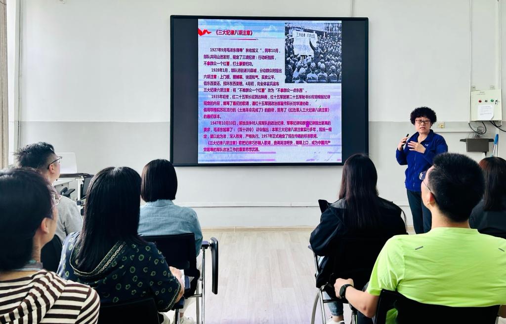 杨春丽结合自身专业特点,通过红色歌曲这一艺术载体,带领大家一起学习了党的纪律建设的历史沿革。中国共产党在建立之初,就把严明纪律作为红色基因深植自身肌体之中,在领导新民主主义革命过程中不断加强纪律建设,并在新中国成立后不断发展和完善纪律建设。在讲到新民主主义革命过程中的党纪建设时,她通过引用红色歌曲《三大纪律八项注意》向大家做了生动形象的理论阐释。她指出,在领导井冈山斗争的过程中,毛泽东提出了“三大纪律、六项注意”,把铁的纪律作为建军建党的基础。其《三大纪律八项注意》歌曲的由来和最终形成不仅见证了中国工农红军的战斗历程,更见证了中国人民解放军的纪律建设。