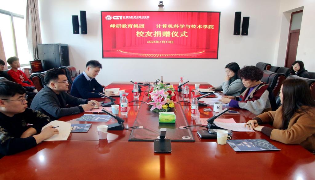 1月10日下午,计算机科学与技术学院与山东峰研教育集团举行了校友捐赠仪式。峰研教育集团总经理黄军杰,学校合作发展处(校友工作办公室)副处长邵伟然,学院党委书记杨春丽、副书记吕海霞、李云枝,全体辅导员老师以及部分学生代表参加了本次捐赠活动。