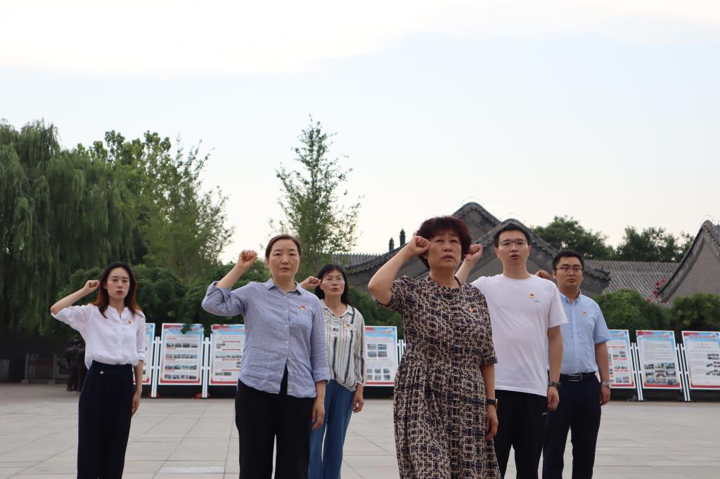 渤海革命老区是中国共产党建立基层组织并开展活动较早的地区之一,是抗日战争时期创建的山东最大的平原抗日根据地,也是解放战争时期整个华东战场可靠的大后方,为山东三大战略区之一,为中国革命胜利做出了不可磨灭的贡献。在长期的革命战争中,这里孕育出“不屈不挠、艰苦奋斗、顾全大局、无私奉献”的渤海革命老区优良传统。在这里,党员干部们在讲解员的带领下,集体参观了园区内的主展馆、碑廊等场所,一起深刻学习了渤海革命老区优良传统以及在革命时期先烈们英勇斗争的光辉事迹,感受老渤海精神,体会共产党人的初心使命,并观看党性教育专题教学片。在渤海革命老区教育基地广场前,全体党员在革命先烈雕像和党旗前重温了入党誓词。