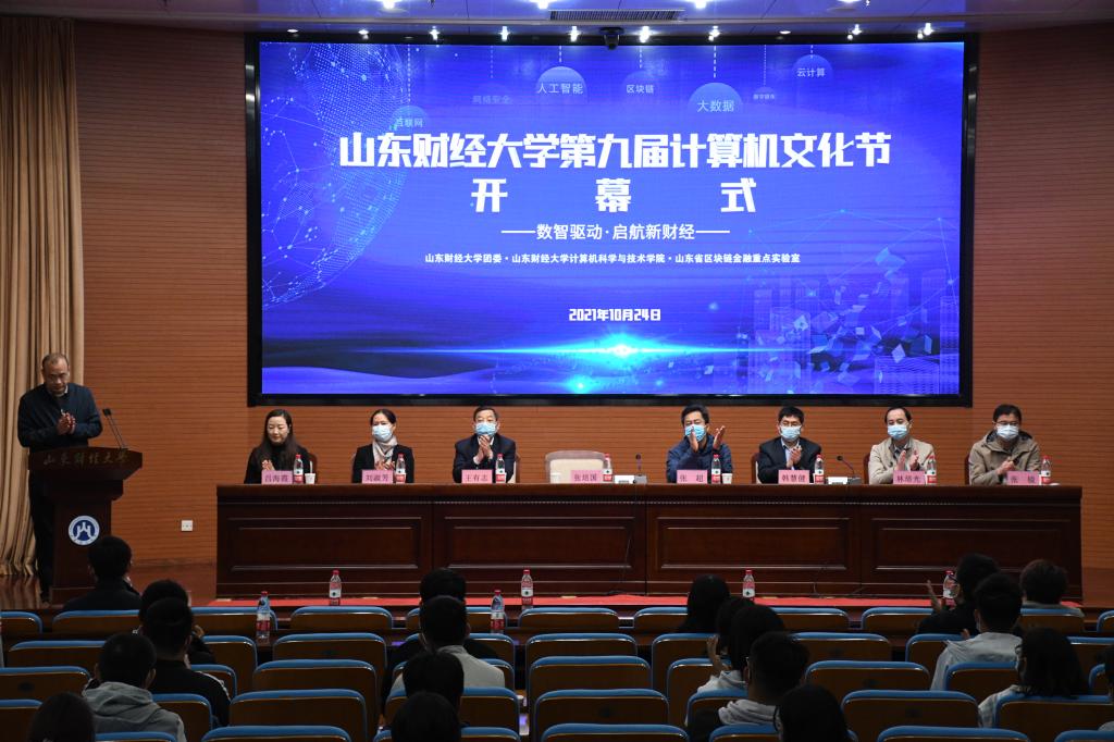 副校长张培国,校团委书记张超,计算机科学与技术学院党委书记王有志,山东省区块链金融重点实验室党委书记刘淑芳,计算机科学与技术学院院长兼山东省区块链金融重点实验室执行主任韩慧健,计算机科学与技术学院副院长林培光,计算机科学与技术学院院长助理张锐出席开幕式。国际经贸学院、会计学院、文学与新闻传播学院、数学与数量经济学院、统计学院院长应邀岀席了开幕式,计算机科学与技术学院师生代表近200人参加了开幕式。开幕式由计算机科学与技术学院党委副书记吕海霞主持。