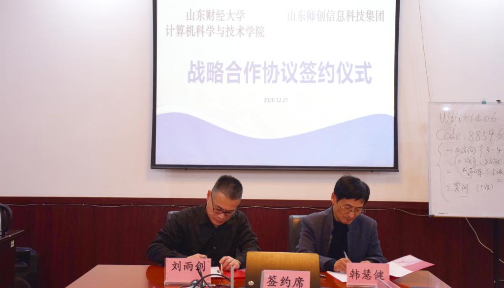 韩慧健、郭亮、刘雨剑作为本方代表,分别在校企战略合作框架协议上签字。学院服务社会工作办公室、就业办公室有关同志出席座谈和签约仪式。