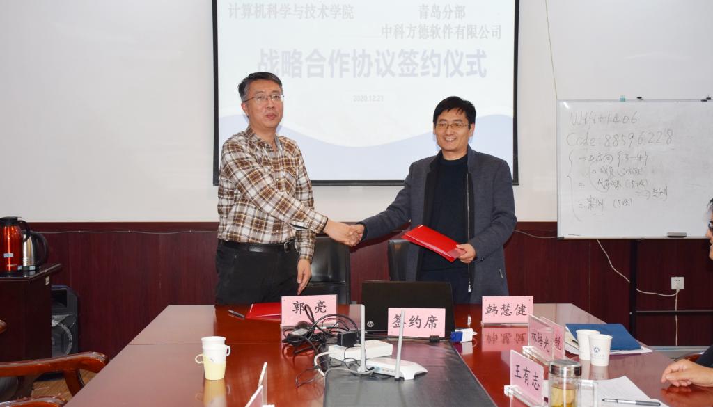 12月21日下午,学院政产学研合作座谈会暨战略合作协议签约仪式在燕山校区1406会议室举行。中科院软件研究所青岛分部常务副所长郭亮,中科院软件研究所青岛分部副所长朱懿,中科院软件研究所青岛分部科技处马小斐,山东师创信息科技集团副总裁、产业大学总经理刘雨剑,师创集团资产运营部总经理伍虹,师创集团产业大学研发与教质总监张羽来访。学院党委书记王有志,院长、山东省区块链金融重点实验室执行主任韩慧健,副院长林培光,党委副书记吕海霞,院长助理张锐出席仪式。