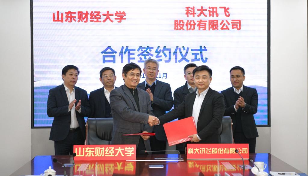 副校长张新出席并讲话。合作发展处处长刘奇耀、计算机科学与技术学院党委书记王有志、院长韩慧健、副院长林培光、副书记吕海霞、院长助理张锐及系主任,科大讯飞销委会副总裁黄飞云、智慧城市高教业务线总监张磊、智慧城市行业总监姚家成、大数据与人工智能教研总工年夫坤、高教业务山东市场总监井辉、山东大区市场经理刘青等出席了签字仪式。