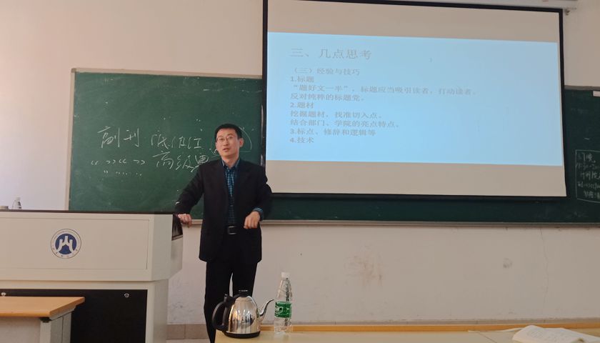 其中关于新闻稿的写作,刘宝璋强调文章要善于观察日常生活中的点点滴滴,以小见大,感知师生的思想动态,同时,要有创新性话语,将自己置身于大时代背景之中,从而创作出迎合读者需求的新闻稿。同时,在撰写新闻稿时要把握好政治性、真实性、时效性三大原则。即在发现新闻焦点后要及时高效地完成新闻稿的撰写,才能达到博人眼球的效果。但也要避免盲目夸大其辞,对事件应做出客观中肯的评价。此外,刘宝璋还向同学们解释了标点、修辞、逻辑、技术方面等需要注意的问题。