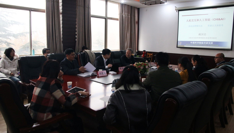 戴国忠老师首先向学院领导及教授阐述了人机交互(CHI/CG)的历史及其重要的历史贡献人物。戴国忠老师在报告中对人机交互进行重定义,提出三元世界观点,即人、机、物三者辩证关系,在人机交互界面、人工智能算法和大数据数据三个方面做了系统型的阐述和论证。同时戴国忠老师原创性地提出大交互的概念,即人机交互是心理学、人机交互、设计、认知科学、 社会科学和媒体科学的综合产物。然后,戴国忠老师重点围绕新一代人工智能的核心基础科学问题,详细解读了认知与计算的关系。最后戴国忠老师将人机交互和人工智能同人类命运捆绑在一起,将这一科学领域上升到新的高度。戴国忠老师还与学院领导老师广泛讨论,并对计算机科学与技术学院的学术科研发展道路提出了几条重要的建设性建议。