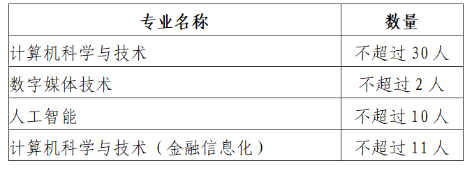 学院接受转专业学生的专业包括:计算机科学与技术专业、数字媒体技术专业、人工智能专业、计算机科学与技术(金融信息化),具体数量如下: