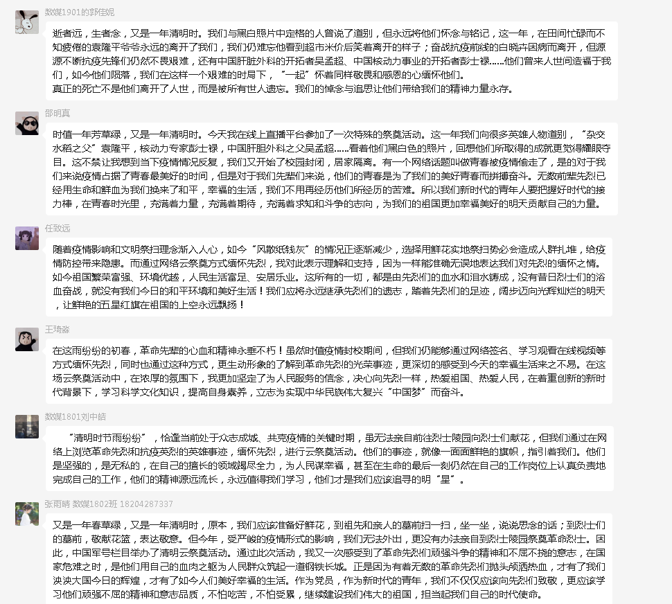 一代人有一代人的长征,一代人有一代人的使命。广大学生党员通过积极参与网上祭扫英烈活动,学习传承英烈不怕牺牲、勇于风险的精神,用英烈精神汇聚起抗击疫情的巨大合力,服从并服务于疫情防控工作大局,积极主动开展志愿服务活动,以实际行动向英雄先烈们致敬!