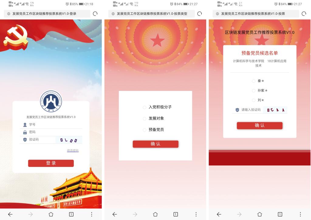 系统具有管理员、学校组织部、学院管理员、辅导员和学生五种角色,实现入党积极分子、发展对象和预备党员三种类型的投票;系统管理员可以设置系统菜单、管理系统角色和投票类型等;学校组织部可以定制投票活动时间并发布活动;学院管理员管理学院班级和辅导员;辅导员设置班级候选人和预备党员投票权限、班级投票时间并发布班级投票、查看投票情况及投票结果,进行区块链数据校验等;学生可在投票时间范围内登录后选择候选人输入验证码即可进行投票,投票界面简单、操作方便; 投票数据上传到蚂蚁区块链Bass平台,并提供验证和区块链存证证书,确保数据安全、保密、可追溯、不可篡改,保证投票公平、公正,保障疫情期间发展党员工作顺利进行。