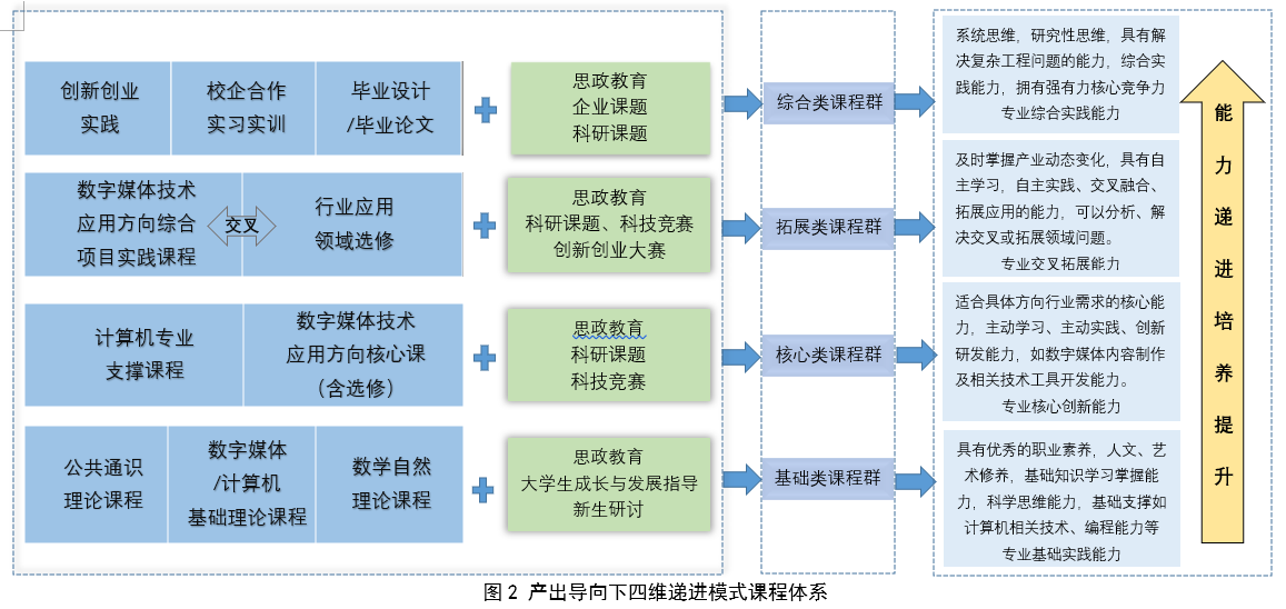基于上述特色,本专业对每门课程均细化其培养目标与可达成的能力标准,并以此为基础构建了科学、系统的递进式课程群。该课程群涵盖专业基础类、专业核心类、专业拓展类以及综合应用类四大模块,形成了“面向产业需求、突出专业特色、强化应用实践、鼓励交叉创新”的完整培养路径。